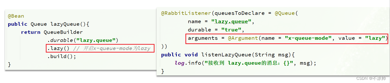 扩大队列容积,提高堆积上限。可以使用RabbitMQ惰性队列,惰性队列的好处主要是: