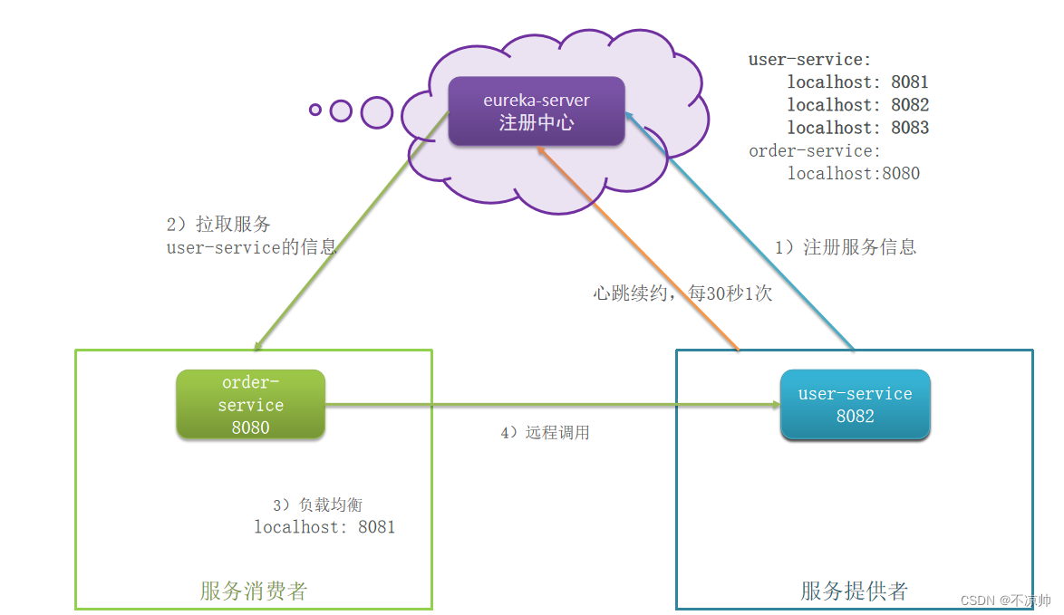 服务注册:服务提供者需要把自己的信息注册到eureka,由eureka来保存这些信息,比如服务名称、ip、端口等等