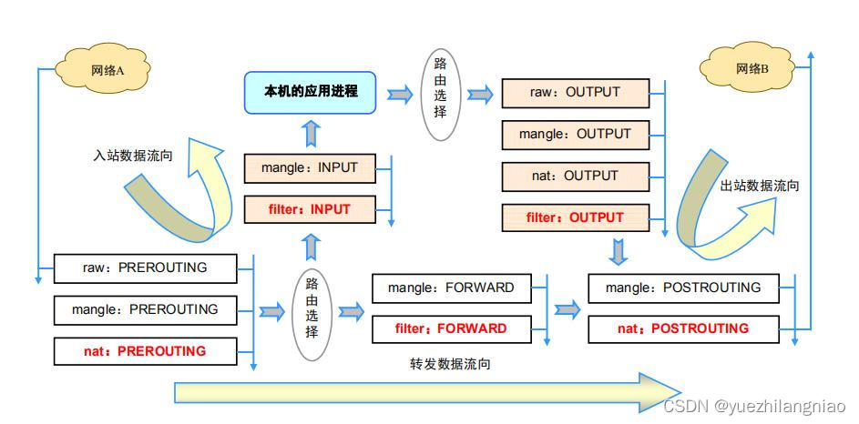 用户层 ---> 调用iptables ---> ip_tables内核模块 ---> Netfilter(系统安全框架) ---> 过滤请求