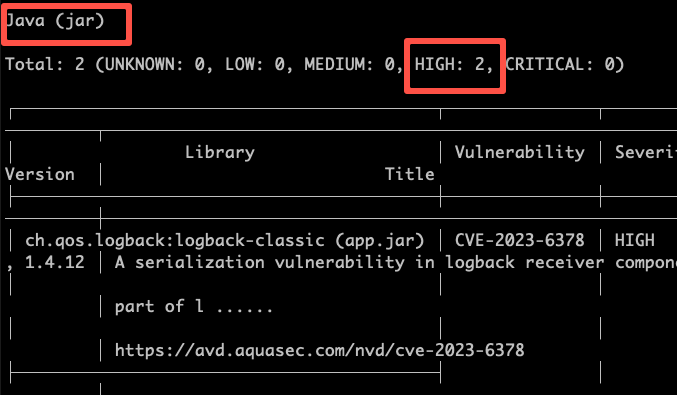 可以使用以下命令扫描镜像。Trivy 会扫描镜像中的两个漏洞,就像镜像中的 java jar 一样。扫描结果将以人类可读的格式显示。