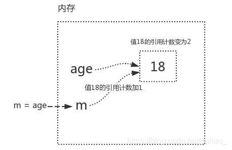 m=age (把age的内存地址给了m,此时,m,age都关联了18,所以变量值18的引用计数为2)