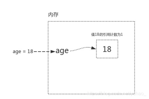 变量值18被关联了一个变量名age,称之为引用计数为1