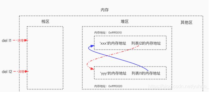 >>> l2=['yyy'] # 列表2被引用一次,列表2的引用计数变为1