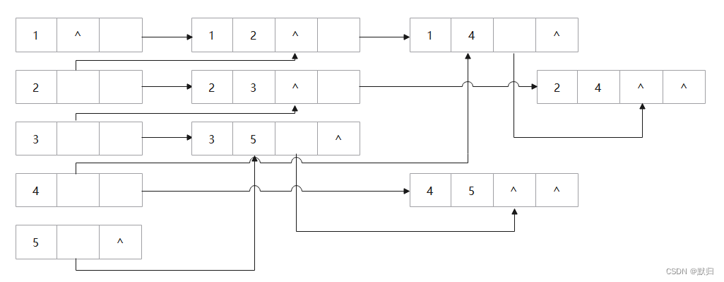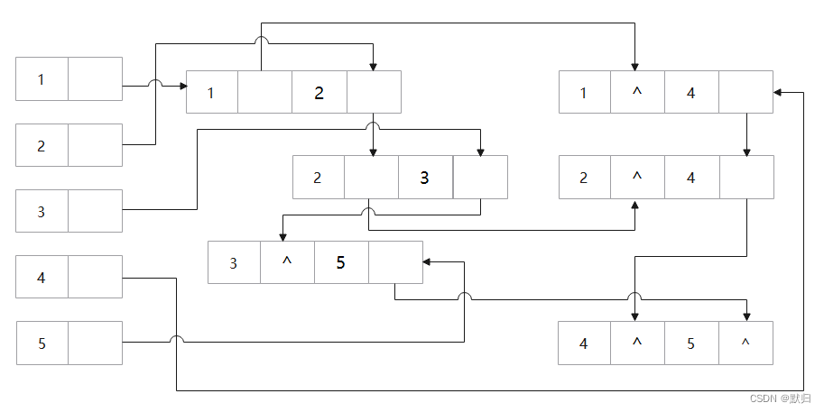 十字链表是为了解决有向图用邻接表存储时不便于计算顶点的入度,因此需要在邻接表的基础上额外保存入边。以上文图的概念中给出的有向图为例,其用十字链表表示如下: