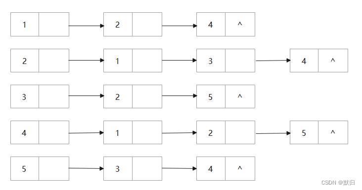 以上文图的概念中给出的无向图为例,其用邻接表表示如下: