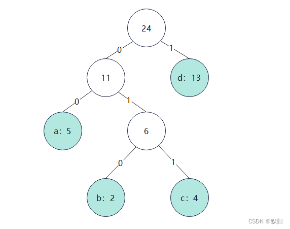 哈夫曼编码的规则为,经过左儿子的路径都编码为0,经过右儿子的路径都编码为1。从根结点出发,到达叶子结点的路径上的“0”“1”编码组合起来就是该叶子结点对应字符的哈夫曼编码。对数据“abcdabcdacdddcdadddadddd”按每个字符出现的次数构建哈夫曼二叉树,并进行哈夫曼编码,结果如下图所示,a的哈夫曼编码为00,b的哈夫曼编码为010,c的哈夫曼编码为011,d的哈夫曼编码为1,这样最终的编码长度为13*1+5*2+4*3+2*3=41,即为树的带权路径长度,而哈夫曼树的带权路径长度最短,因此这样编码得到的二进制串也最短。