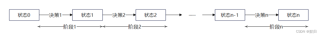 动态规划是运筹学的一个概念,是用来解决多阶段决策过程相关问题的一种思想,一般简称为DP(Dynamic Programming),所谓多阶段决策过程是指有一个活动的过程可以分成若干个相互联系的阶段,在它的每一阶段都需要做出决策,不同的决策将影响活动最终的结果,这个过程如下图所示,活动的初始状态为状态0,经过一次决策后转移到状态1,这是一个中间结果,经过n次决策后转移到状态n,而状态n即为活动最终的结果。