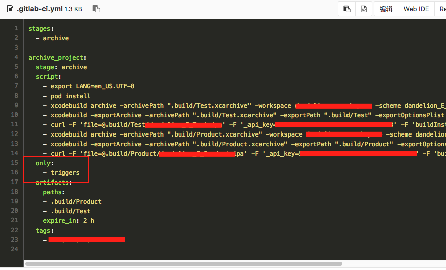 只为打tags的行为创建artifacts。artifacts将会在job执行完毕后送到GitLab ui前台来,你可以直接下载它(tag、details、pipeline 的下载按钮上都会出现)。