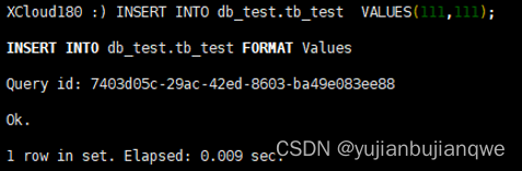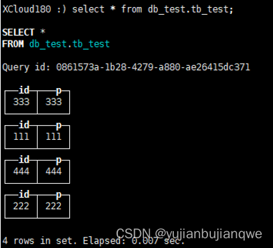 | INSERT INTO db_test.tb_test VALUES(111,111); INSERT INTO db_test.tb_test VALUES(222,222); INSERT INTO db_test.tb_test VALUES(333,333); INSERT INTO db_test.tb_test VALUES(444,444); |