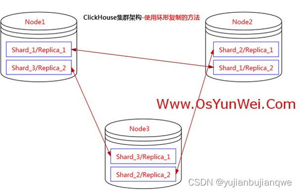 使用3节点服务器搭建ClickHouse集群,在同一个节点放两个分片的数据,部署为环形架构,第一个分片在第一和第二节点上,第二个分片在第二和第三节点上,第三个分片在第三和第一节点上。