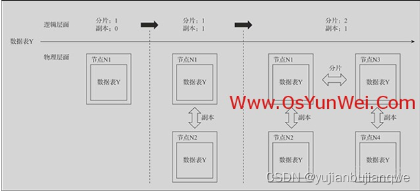 分片和集群的使用方法。从数据表的初始形态1分片、0副本开始介绍;接着介绍如何为它添加副本,从而形成1分片、1副本的状态;再介绍如何引入分片,将其转换为多分片、1副本的形态(多副本的形态以此类推),如图下图所示。