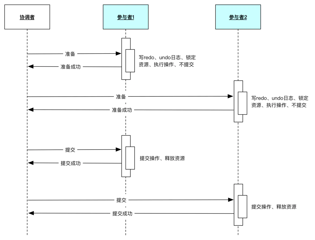 - 提交阶段:如果每个参与者明确返回准备成功,也就是预留资源和执行操作成功,协调者向参与者发起提交指令,参与者提交资源变更的事务,释放锁定的资源;如果任何一个参与者明确返回准备失败,也就是预留资源或者执行操作失败,协调者向参与者发起中止指令,参与者取消已经变更的事务,执行undo日志,释放锁定的资源
