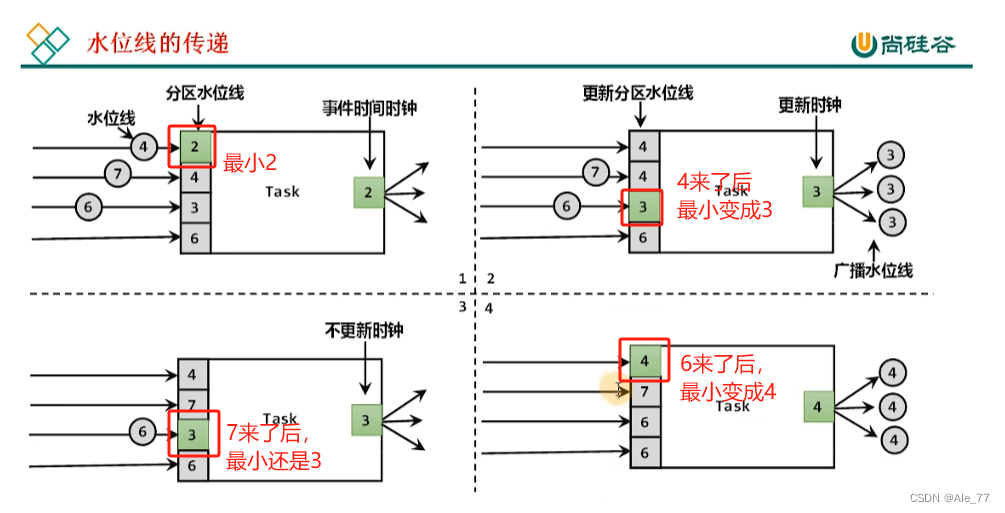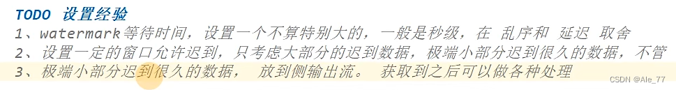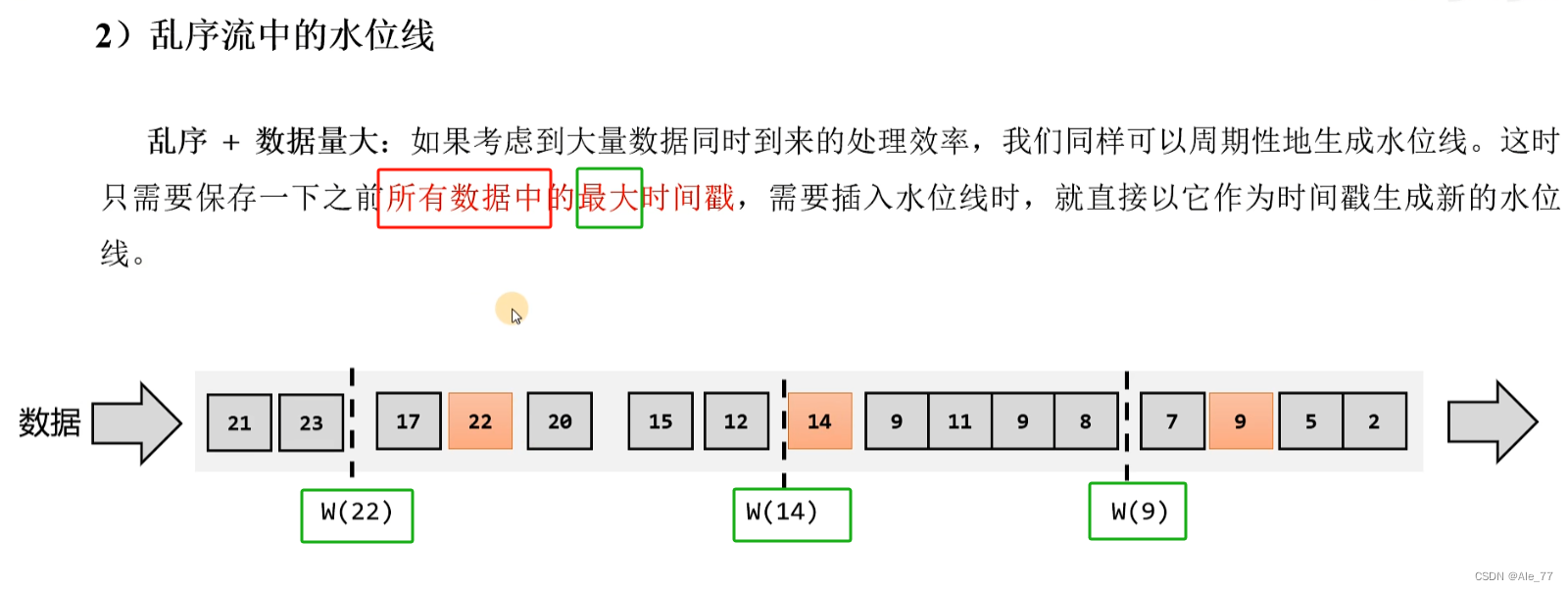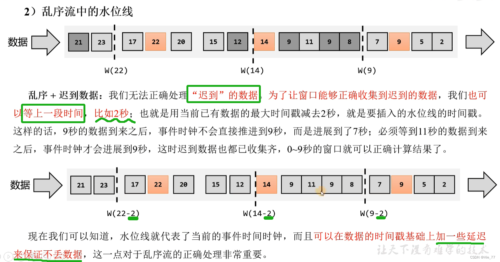本文详细探讨了时间语义中的事件时间、水位线概念及其在处理有序和乱序数据中的应用。介绍了水位线的工作原理、生成策略,以及如何处理迟到数据和窗口的动态创建。还涉及了水位线的传递机制和空闲等待策略,以及迟到数据的管理和窗口的推迟关闭。