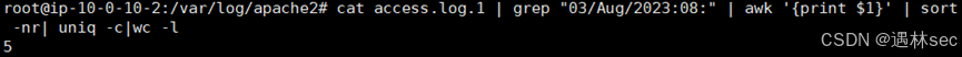 grep “03/Aug/2023:08:” access.log.1 | awk ‘{print $1}’ | sort -nr | uniq -c | wc -l