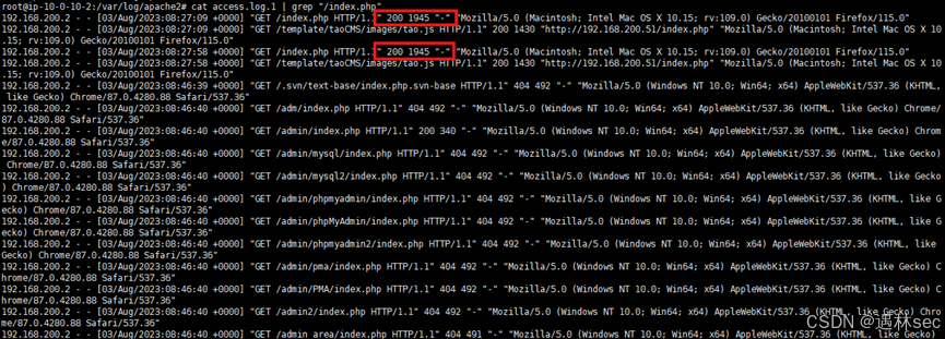 同理,知道了黑客IP,就可以同时筛选包含index.php的文件,wc -l 命令用来统计行数
