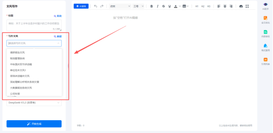 后续使用时,只需在写作页面点击 文风下拉菜单,就能自由切换已保存的多种风格——每一种都能反复调用,高效又省心!