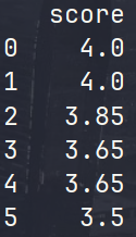 输出:+-------+------+ | score | rank | +-------+------+ | 4.00 | 1 | | 4.00 | 1 | | 3.85 | 2 | | 3.65 | 3 | | 3.65 | 3 | | 3.50 | 4 | +-------+------+