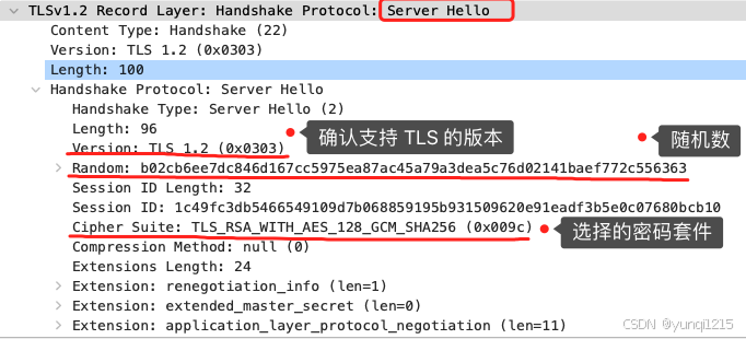 第二步,服务器端接收到请求后,确认双方使用的加密方法、并给出服务器的证书、以及一个服务器生成的随机数。