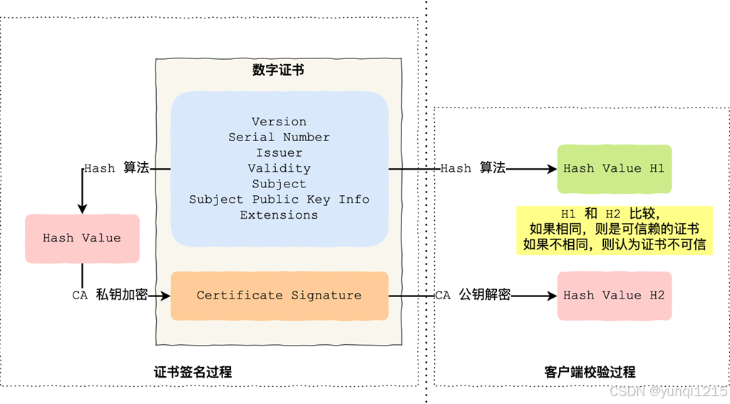 最后比较 H1 和 H2,如果值相同,则为可信赖的证书,否则则认为证书不可信。
