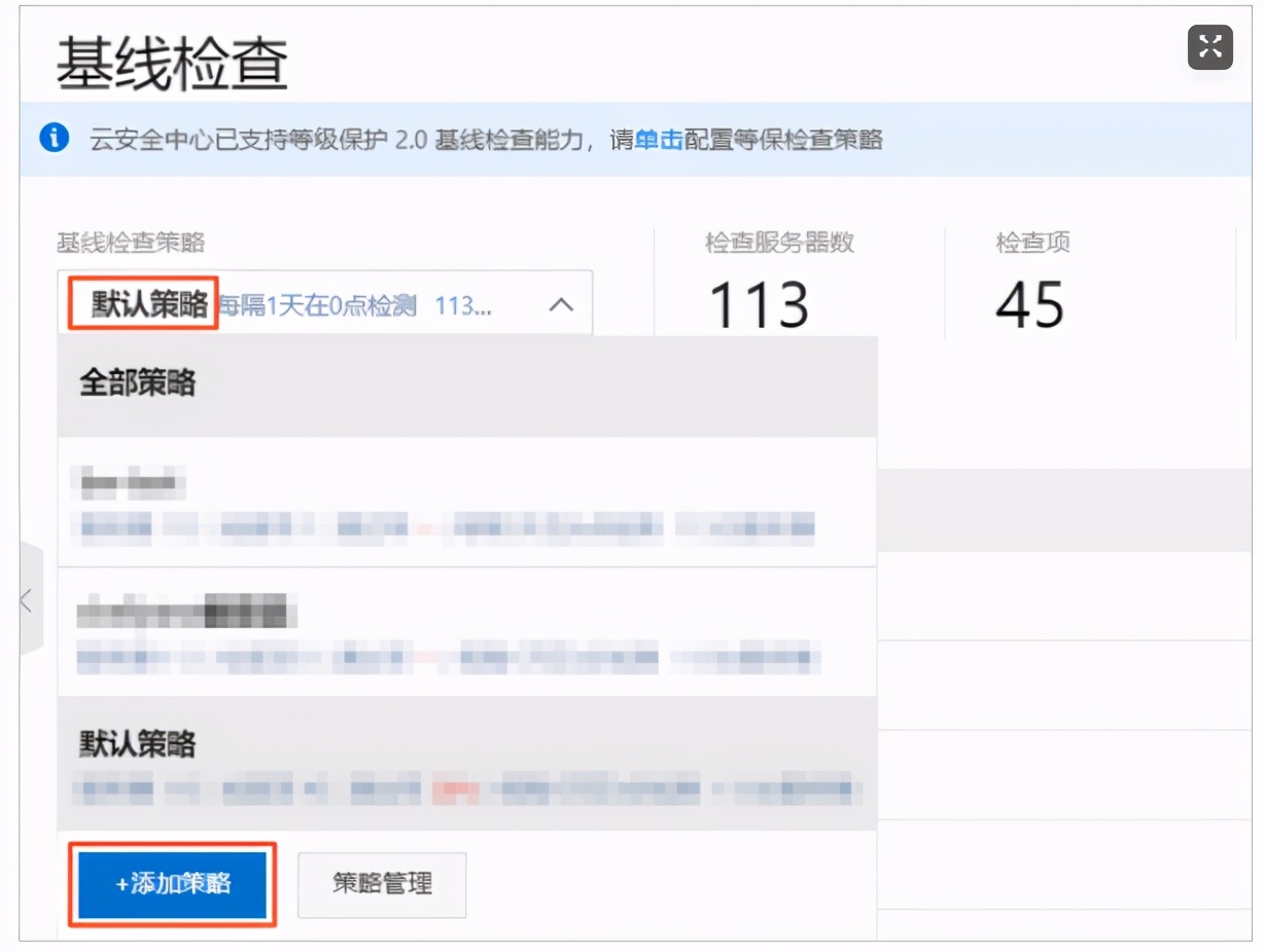 在基线检查策略区域,单击默认策略,然后单击+添加策略。