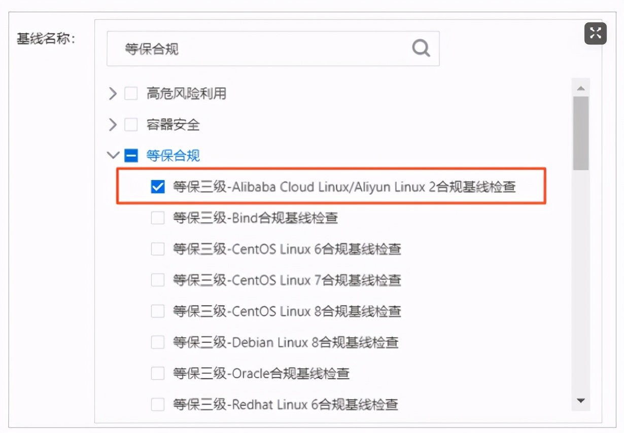 - 基线名称:在搜索框输入等保合规进行搜索,在搜索结果中选中等保三级-Alibaba Cloud Linux/Aliyun Linux 2合规基线检查。