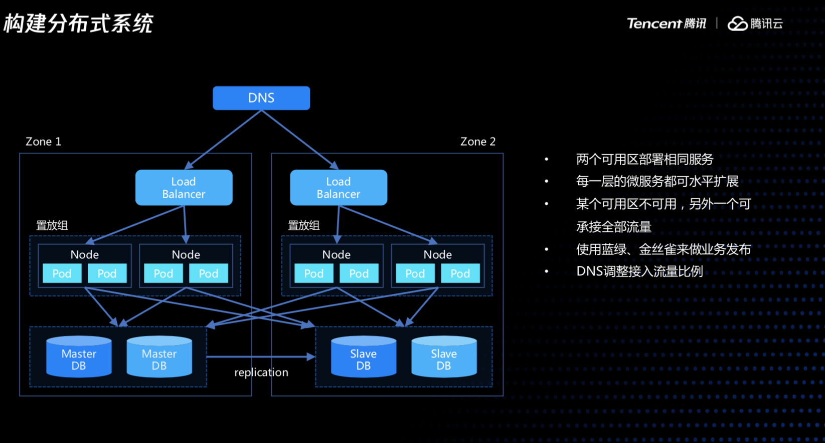 融合了上面的一些的设计理念之后,我们的业务系统首先要做一定的冗余,在多个可用区部署相同的服务,流量可能对外要提供两个不同的入口,在入口处对流量进行分配,当出现导致网络隔离的问题时,可以直接从前端进行流量切换,微服务和数据库也做了拆分,使得每个服务都可以单独做自动伸缩。整体看来,就是一个比较合理的分布式的业务系统。