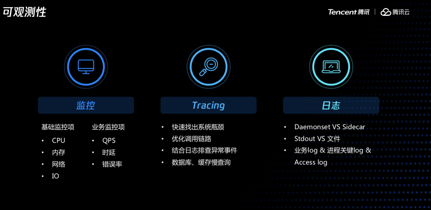 业务部署后,我们需要有一套问题发现、问题定位的手段,这样大家才能安心。常用的手段有监控、tracing以及日志系统。