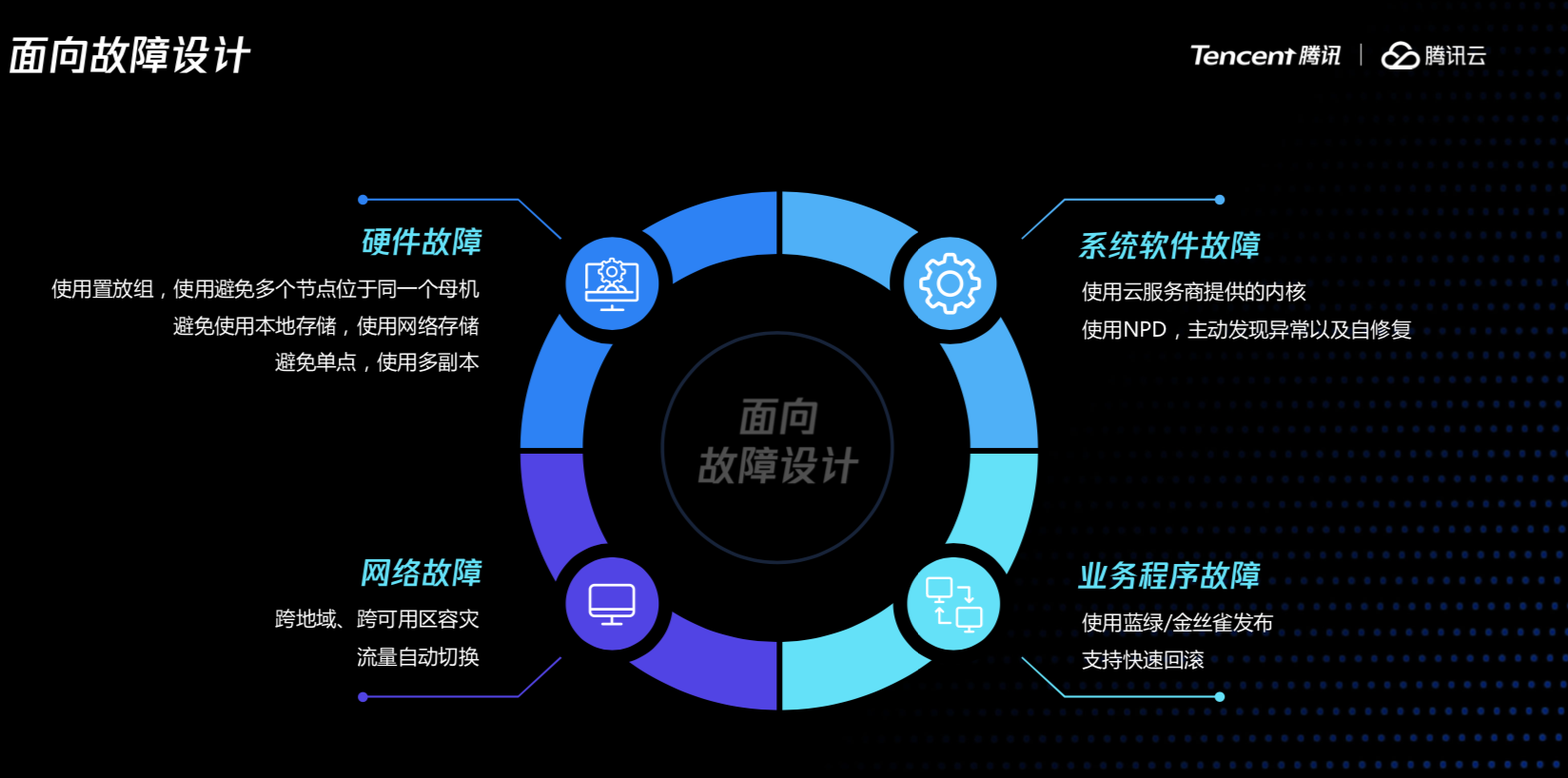 常见的故障有网络故障、硬件故障、系统故障、业务故障,其中网络故障需要考虑业务部署的时候是不是要做好分区的隔离,比如可以在多个区做容灾和流量切换的机制。对于硬件故障,需要考虑一台母机挂了以后,能够结合云服务商的能力来保证同一个用户下面的子机尽量打散;同时为避免单点故障,一个服务可以多一个副本,比如虚拟机挂了以后,可以做一定的冗余。系统软件建议提供云服务商提供的系统内核,因为他做了很多优化。业务的故障,我们平时在发布过程中不要一次性马上把业务发布上去,要流量一点一点逐步发到线上,同时要做好一个预案,假如新版本问题,能否马上回滚到之前的版本。