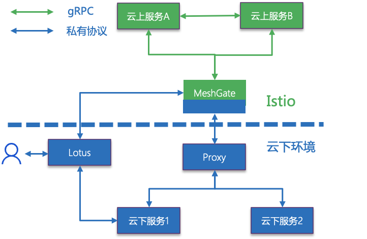 - 网格服务调用云下服务,使用 gRPC 协议;