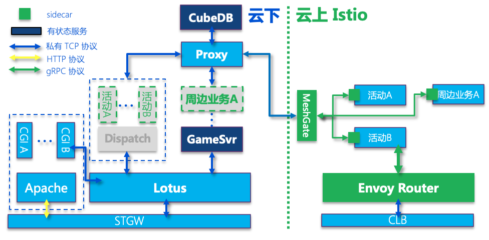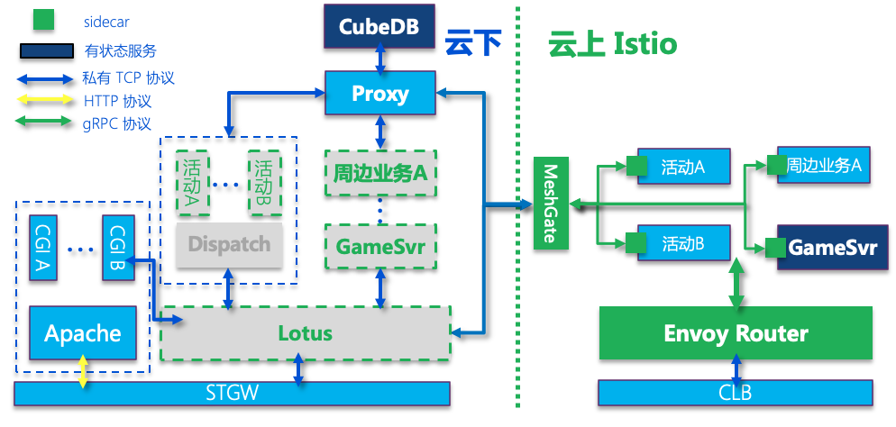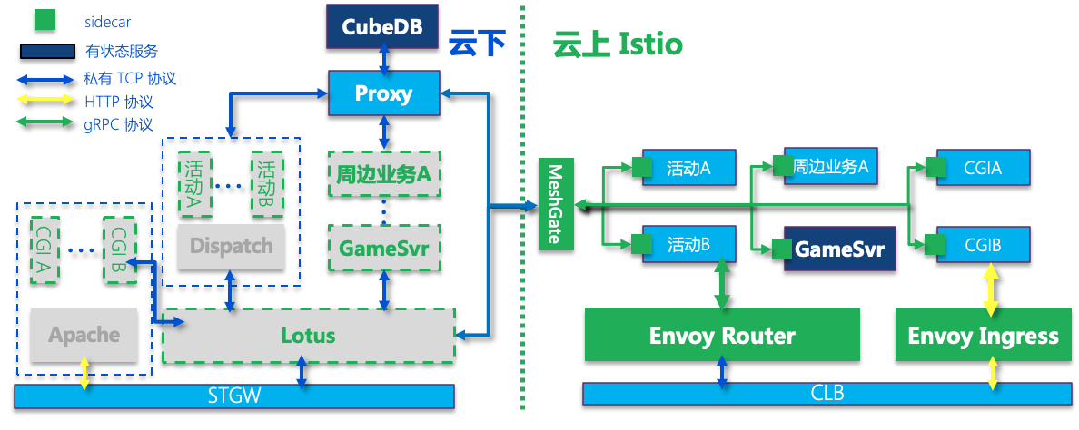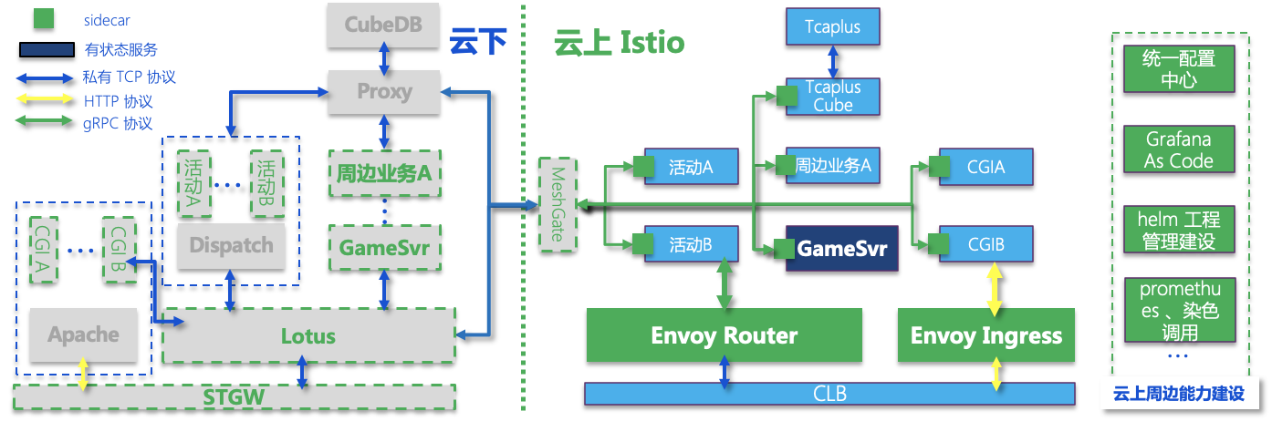 在云下,我们是一个全区全服的架构,所有的游戏业务都在一个集群之中。但由于我们组织架构以及业务形态的原因,期望上云之后,不同的业务团队工作在不同的业务 K8s 集群,而对于大家共用的服务,则放到公共集群下管理。因此在迁移上云的过程中,则还需要做更多的适配迁移工作。