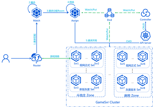 因此借助云原生的能力,我们打造了一套易伸缩、易维护和高可用的单局类 GameSvr 架构。如下图所示: