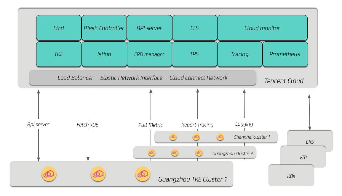 在 Istio 层面,由于我们的 Istio 服务托管给 TCM 团队(腾讯云服务网格 TCM),在 TCM 同学的大力支持下,结合我们目前的组织架构以及业务形态,实现 Istio 多集群下控制面信息的互通,由此我们在多集群之间的互相调用,成本就很低了。如下是 TCM 相关的后台架构:
