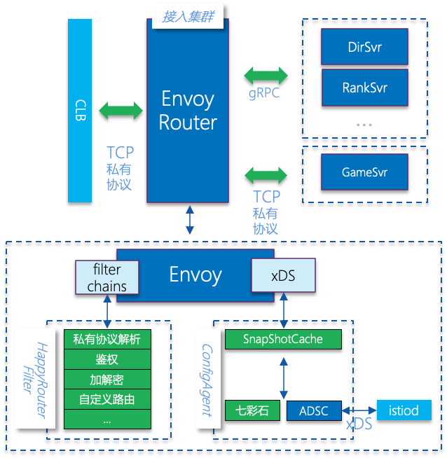 为此,我们基于 CNCF 旗下的开源项目 Envoy 的基础之上,支持私有协议的转发,并对接 Istio 控制面,使之适配我们原有的业务模型,并实现私有通信鉴权,加解密,客户端链接管理等等能力,最终完成接入服上云的工作。整体技术框架如下图所示: