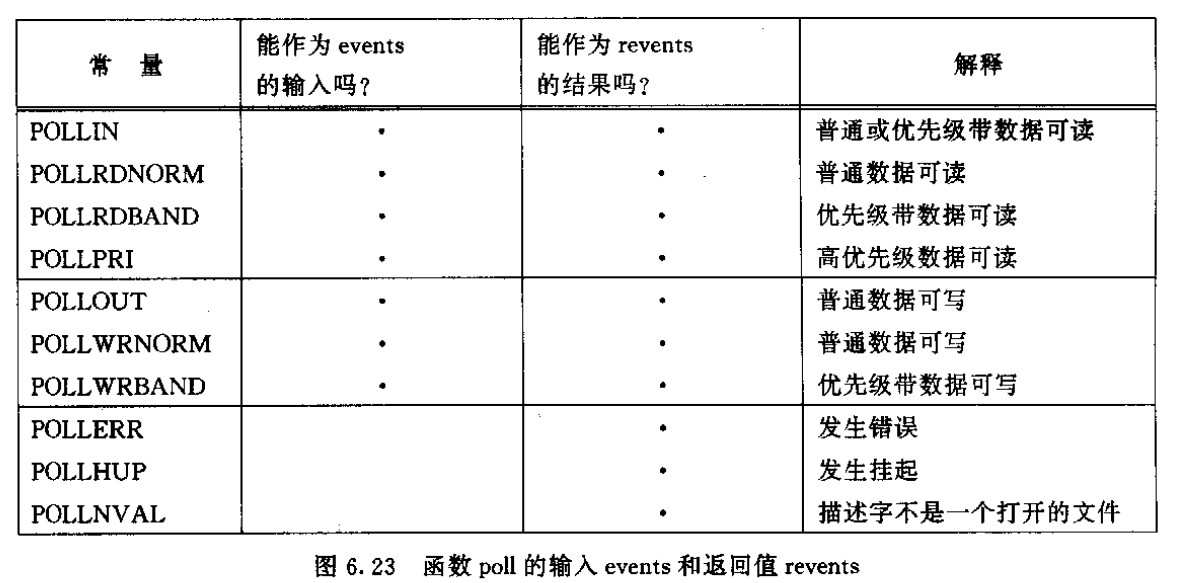 };要测试的条件由成员events规定,函数在相应的revents成员中返回的描述字的状态。(每个描述字有两个变量,一个为调用值,另一个为结果,一词避免使用值-结果参数)。这两个成员中的每一个都由指定某个条件的一位或者多为组成。下图列出了用于指定标志events并测试标志revents的一些常值