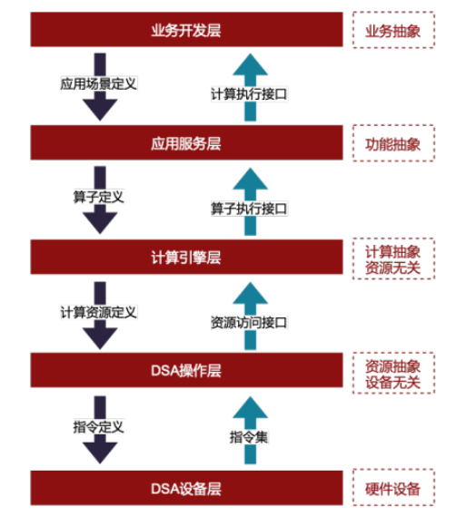 基于上述目标,将一个异构计算的系统抽象为五层(如下图所示),自下而上分别是:1)DSA设备层(DSA Device Layer),2)DSA操作层 (DSA Operating Layer),3)计算引擎层(Scheduling Operating Layer),4)应用服务层(Application Service Layer)和5)业务开发层 (Business Development Layer),详述如下。