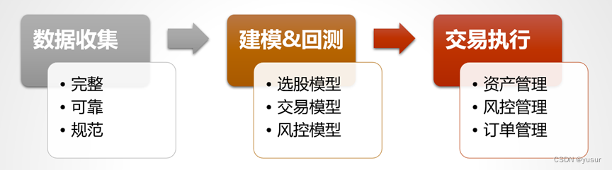 - 建模&回测:量化投资在研发策略的过程需要考虑alpha模型、交易模型、风控模型、成本模型。 alpha模型是策略的投资逻辑实现,风控模型作用是控制风险,成本模型能最大化收益。