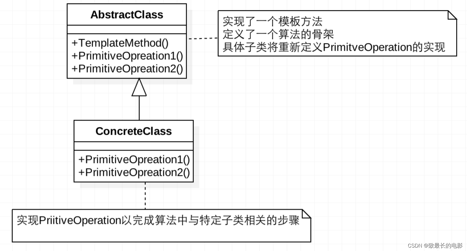 模板模式是在一个抽象类中定义执行的方法,每个方法中都有一个对应的业务流程模板,它的子类需要按照需要来重写模板流程中的方法,子类只需要对这些基本方法进行实现即可,子类并不需要对模板方法进行实现,这种设计模式也属于行为型模式。