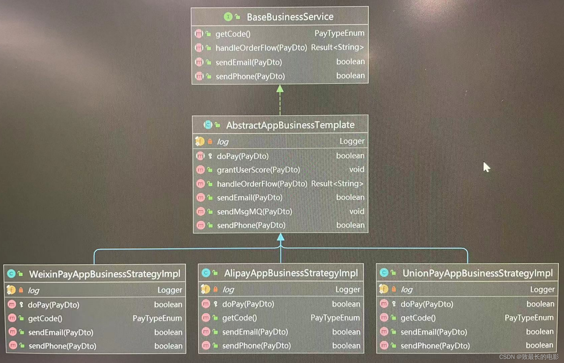 意图:因为发邮件,每个支付通道的格式以及内容不一样,但是发送是一样的,各自的邮件内容及格式可以写在 AlipayAppBusinessStrategy 里,然后 AbstractAppBusinessTemplate 里的 sendEmail 方法写发送功能代码,因为这部分是一样的。