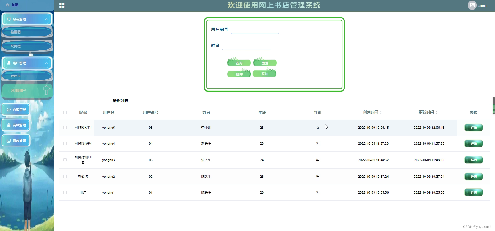 管理员对系统用户的管理,在管理员管理实现管理员用户的管理,包括录入、删除、修改,修改密码通过SESSION获取用户名,然后输入新密码,使用sql命令更新密码。