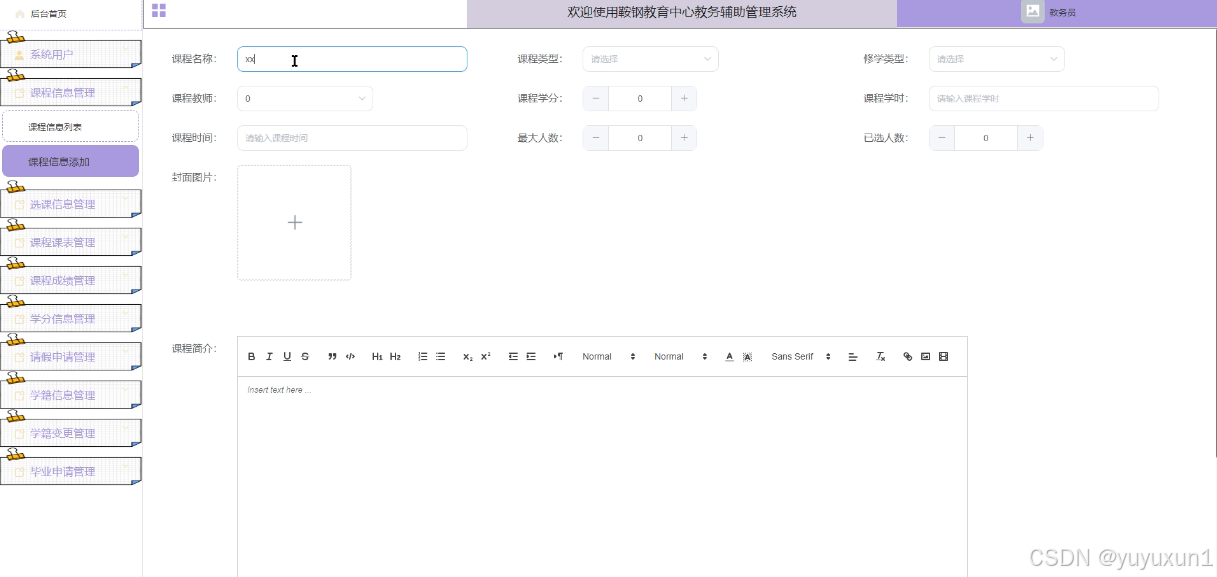 教务员登录系统后台,实现对系统用户、课程信息管理、选课信息管理、课程课表管理、课程成绩管理、学分信息管理、请假申请管理、学籍信息管理、学籍变更管理、毕业申请管理等模块的信息管理。教务员添加课程信息如下图6-11所示。
