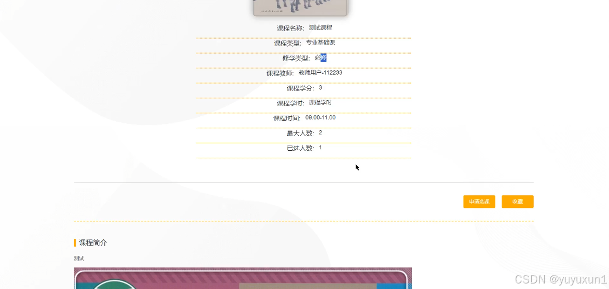 当学生用户点击“课程信息”以后就会给我们展示所有的课程列表,支持通过课程名称对课程信息进行搜索。选择想要选课的课程信息介绍进入到详细界面中,可以查看到课程名称、课程类型、修学类型、课程教师、课程学分、课程学时、课程时间、最大人数、已选人数、课程简介等信息。学生用户可以对课程介绍进行申请选课、收藏。点击申请选课进入到选课信息填写页面,点击“提交”按钮,就会显示选课成功。课程信息详细界面如下图6-5所示。