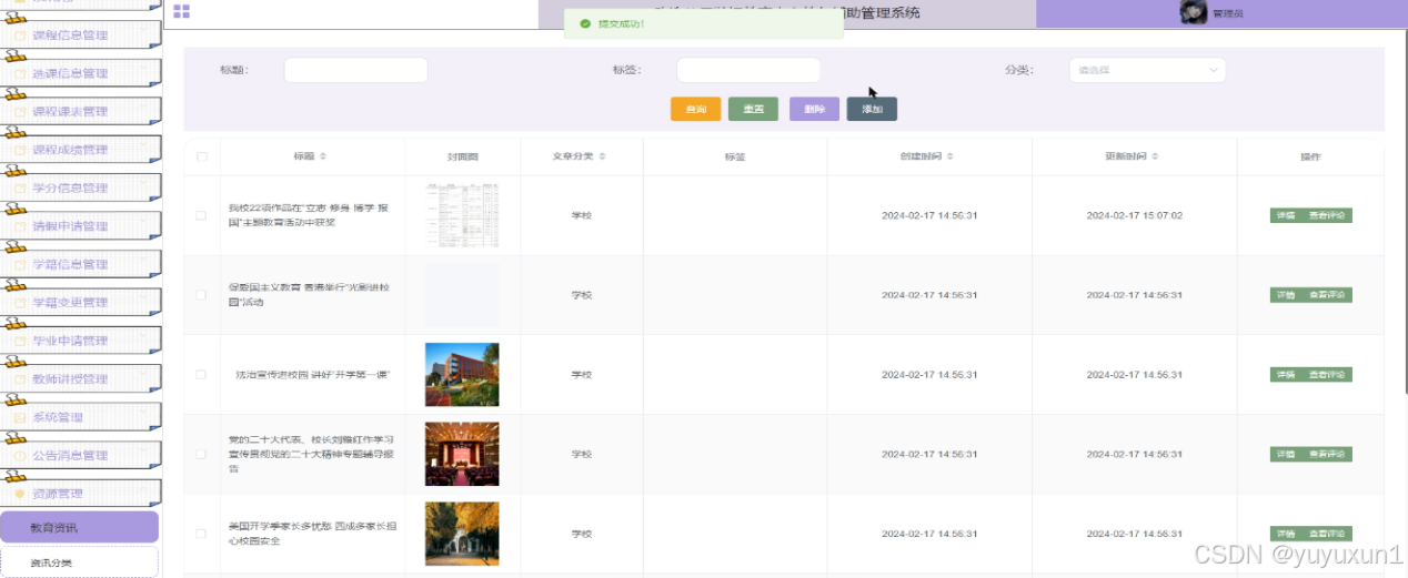 资源管理:管理员可以管理系统中的教育资讯和资源信息,包括资讯分类、教育资源的添加和编辑等操作,为教学和学习提供丰富的资源支持和信息服务。