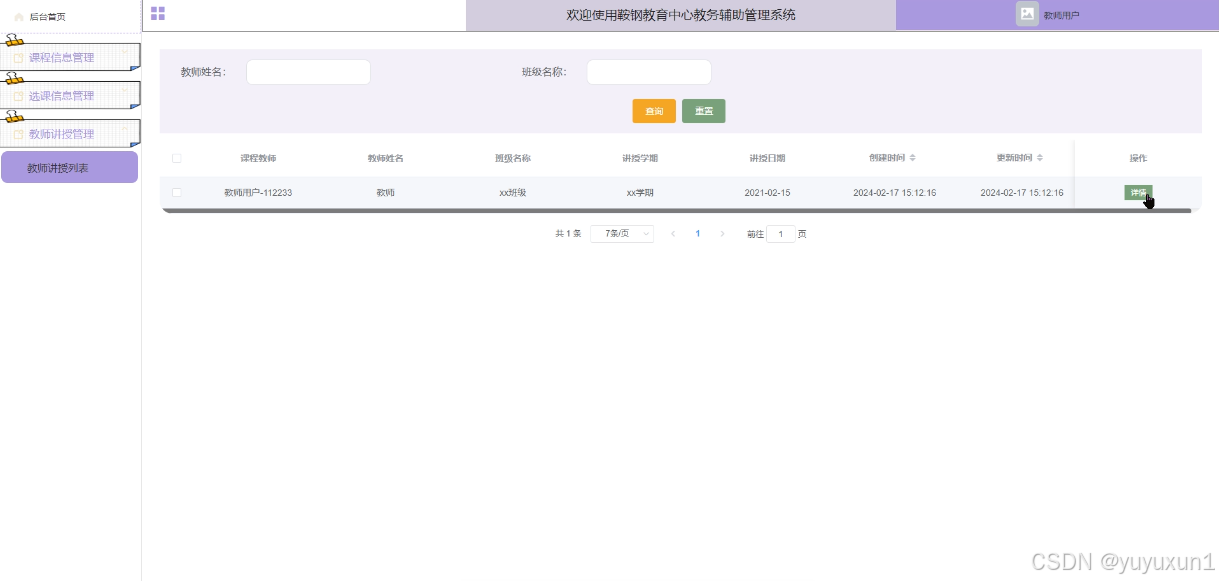 教师讲授管理:教师可以通过点击“教师讲授管理”菜单查看教师讲授信息。这包括教师所负责的课程、授课时间、授课内容、教学进度等,帮助教师有效地组织和管理教学活动。