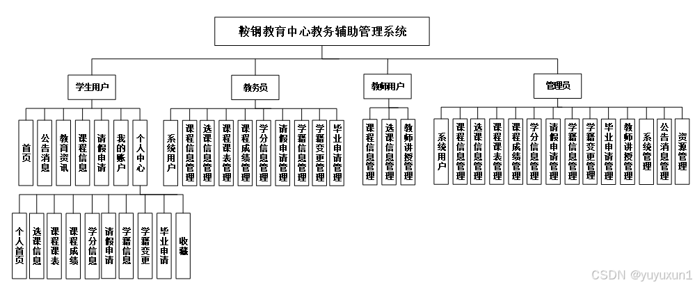 鞍钢教育中心教务辅助管理系统从角色上划分为了学生用户、教务员、教师用户和管理员四种角色。