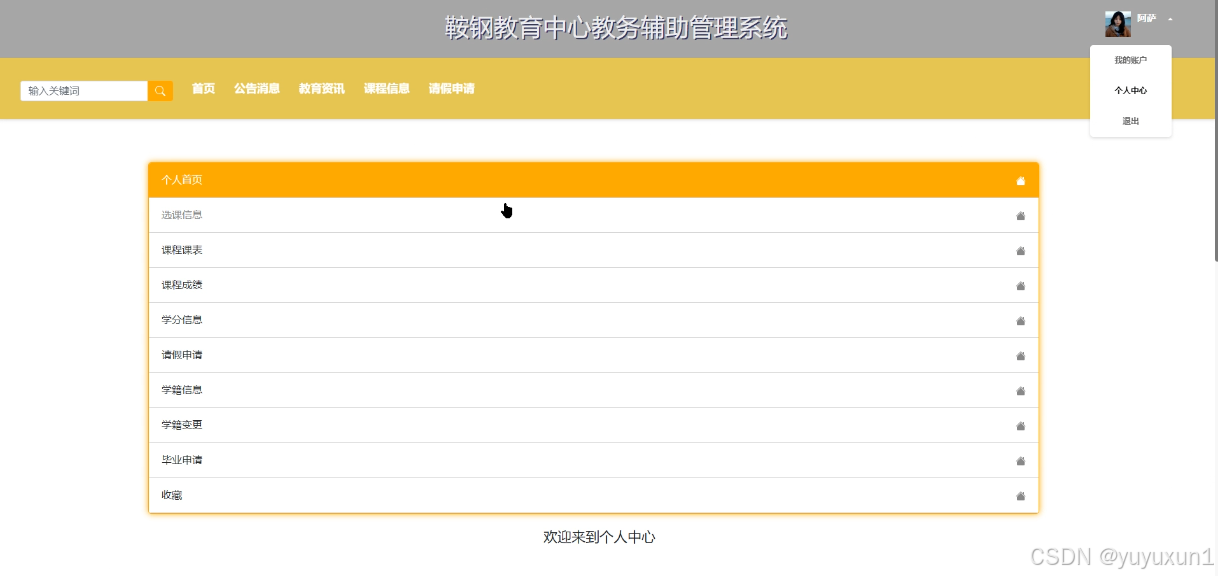当用户点击右上角“账号名”这个按钮,会出现对应的子菜单,学生用户点击“个人中心”可以对个人首页、选课信息、课程课表、课程成绩、学分信息、请假申请、学籍信息、学籍变更、毕业申请和自己收藏的信息进行设置管理。学生用户个人中心界面如下图6-10所示。