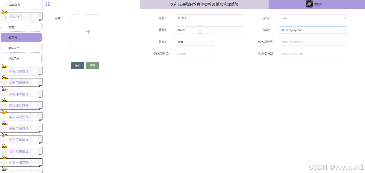 系统用户管理:管理员可以管理系统中的各类用户,包括管理员、学生用户、教务员和教师用户,进行用户信息的添加、修改、删除和查询操作,确保用户信息的完整性和准确性。