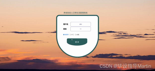 - 登录。在登录界面用户输入账号密码后,选择用户登录,登录成功后会跳转到养老信息管理系统的用户端。用户可以在登录后对个人账号管理。