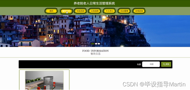 - 老人饮食信息管理。护工可在餐饮信息管理页面查看修改老人的用户名、姓名、性别、年龄、患病史、房间号、送餐类型、送餐时间、餐饮备注等。