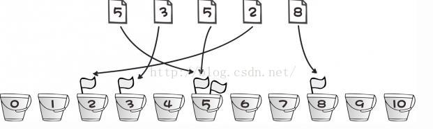 11个桶,编号从0~10。每出现一个数,就将对应编号的桶中的放一个小旗子,最后只要数数每个桶中有几个小旗子就OK了。例如2号桶中有1个小旗子,表示2出现了一次;3号桶中有1个小旗子,表示3出现了一次;5号桶中有2个小旗子,表示5出现了两次;8号桶中有1个小旗子,表示8出现了一次。