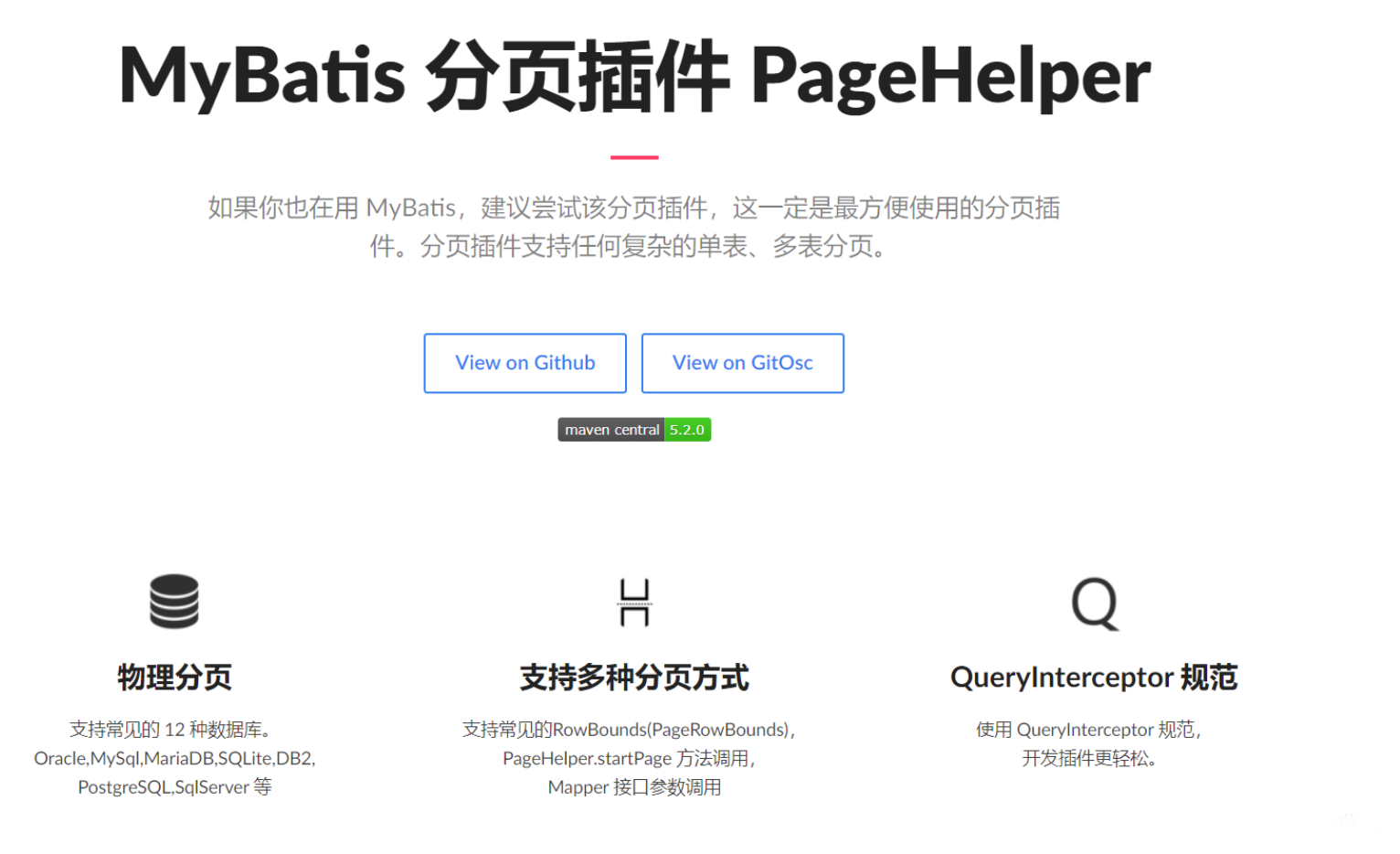 PageHelper 分页插件 pagehelper 是 mybatis 提供的分页插件,目前支持 Oracle,Mysql,MariaDB,SQLite,Hsqldb,PostgreSQL 六种数据库。